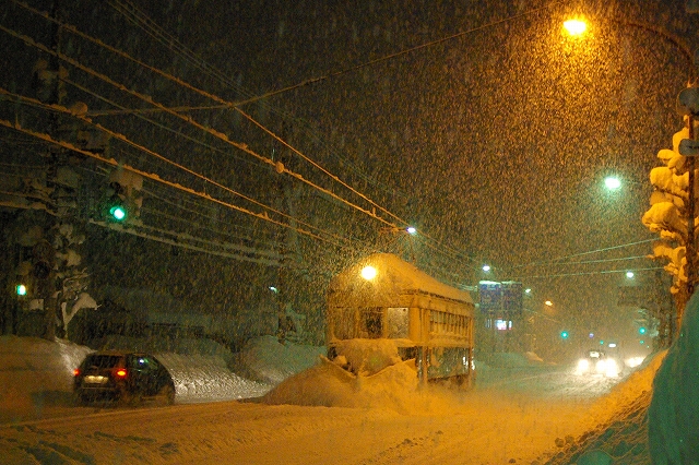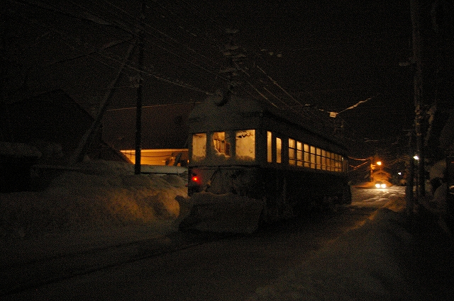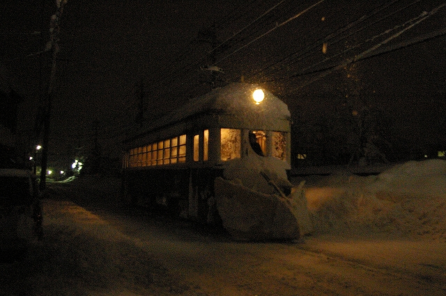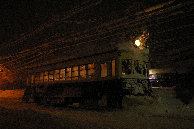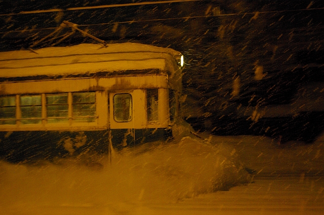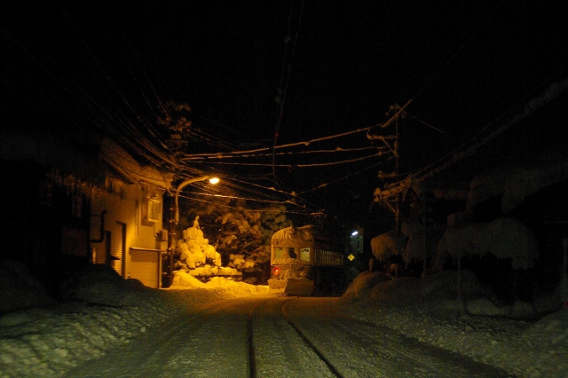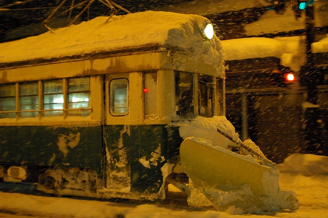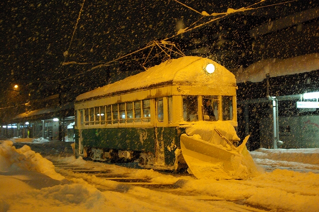 夕方の天気予報で高山ラッセルが走りそうだと判断し、20時過ぎに急遽高山へ向かう。順調に中央道・安房トンネルを走り、現地には24時半着。ラッセルは庫に入ったままだった・・・ウヤ確定。せっかくなので、城端・氷見線ラッセルの様子を見ようと高岡へ移動、大雪だが動きは無かった。頼みの綱の万葉線ラッセルへ。高岡市内が大雪なので粘って待つと、かわいいデ5000系が単コロでやって来た。前回が大雪なのにスカだったため、今年初めて稼働しているラッセルが撮影できた。