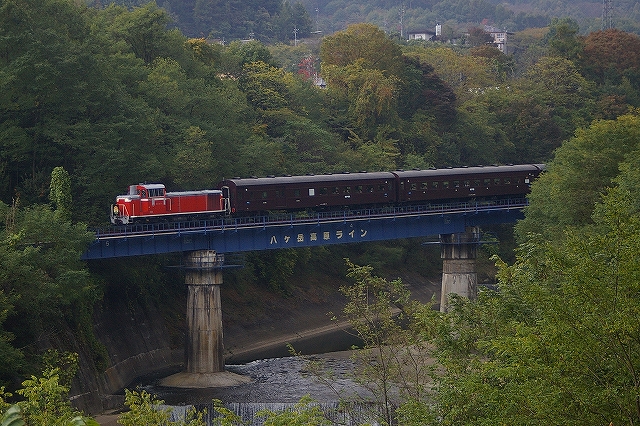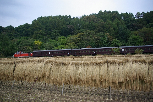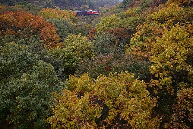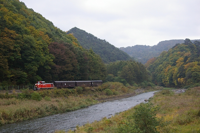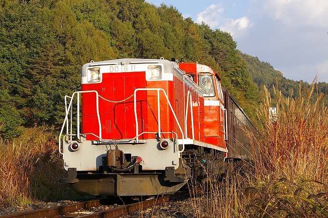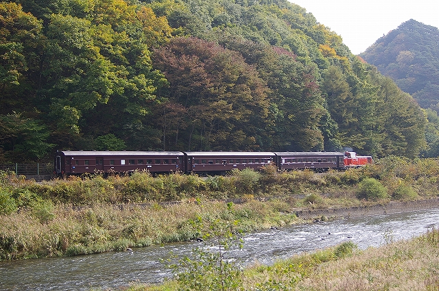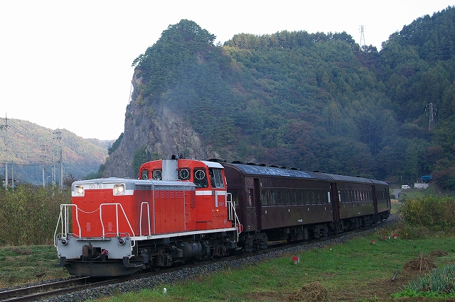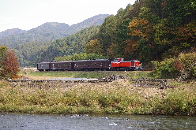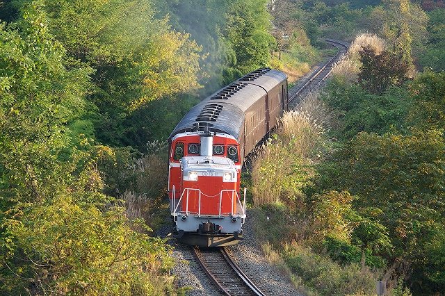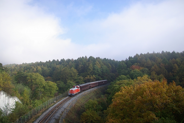 単車で家を4:25に出て、R299を通り、秩父6:30通過。一番奥の峠付近は40km続く細い道、朝日に照らされた紅葉が美しかった。佐久には8時半着。今日のターゲットはDD16牽引のセピア色の小海線号だ。 単車の利点を活かし、追っかけした。DD16は飯山線の時よりも足が早く、また道も混んでいるので、車の追っかけは大変そうだった。折返しの小淵沢大カーブから雨が降りだし、下りはカッパを着て最悪コンディションだった。