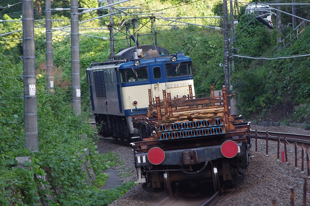 小淵沢駅で夜明け前からずっと張っていたが、明るくなってもEF64チキは到着しなかった。未明の野辺山駅には50人位いたらしい。小淵沢駅には数名で、機関車の調子が悪く遅れているとの事だった(後でDD16の不調と知る)。EF64が甲府を出たらしいという情報が入り、小淵沢に近い撮影地へ。しばらくしてEF64工臨が通過、この区間は深夜の運転なので遅れによる棚ボタだった。小淵沢の発車も全然読めないので大カーブへと急ぐ。既に大勢がスタンバっていた。ずーっと気を張って待っていたが、来ないなぁと気を緩め、本を読みだしたらいきなり来た。 |