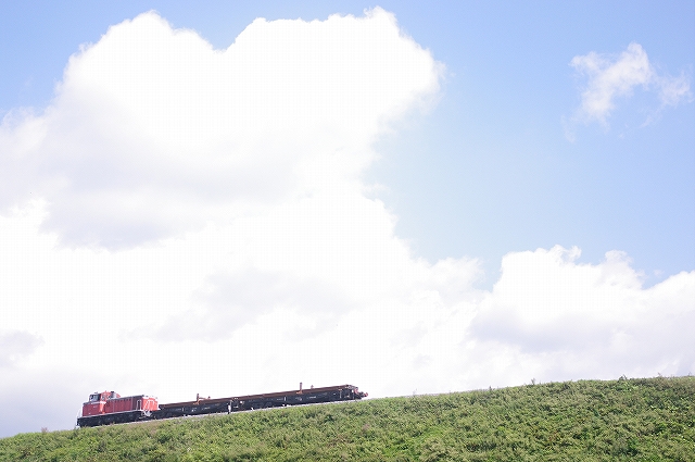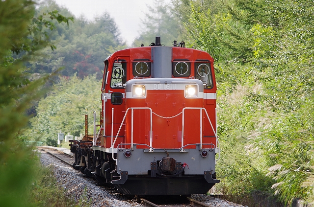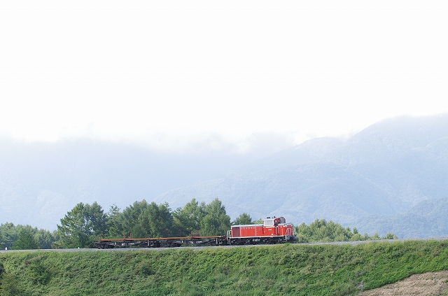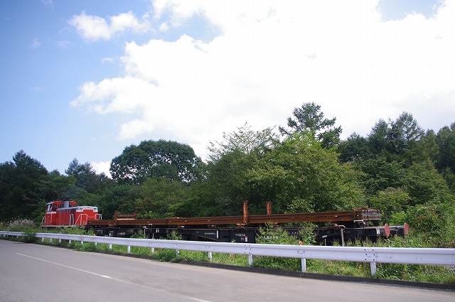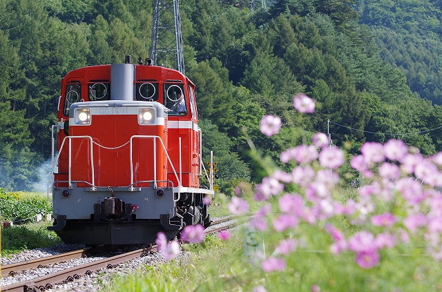 即撤収し出発。清里の先でもう一発。さらに野辺山へ。入換えを撮って、単機回送を撮って小淵沢へ戻り、同じ行程をも一度繰り返す。2往復目は、コンビニに寄ってロケハンしているうちに来てしまい、なんとか大カーブ外側で。野辺山から先、中込までの単機回送も追っかけて、締めは秋らしく天狗岩近くで秋桜と絡めて撮った。 |