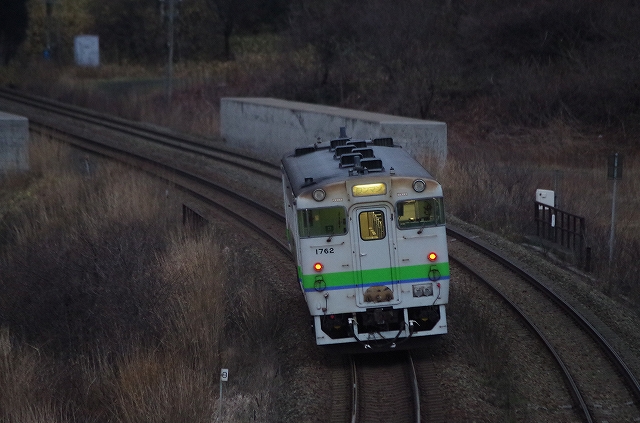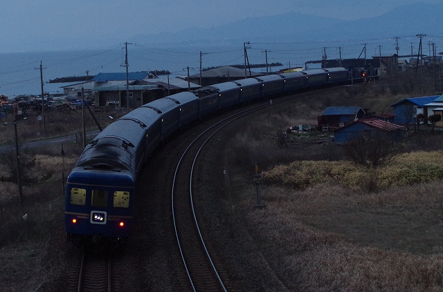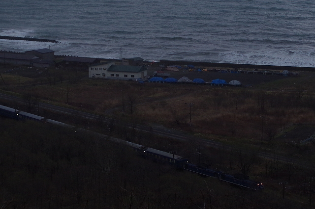 | 早めのチェックインだったので、ひと風呂浴びてから夕練へ。富浦駅の俯瞰は雲の動きが早く、上手く行けば露出が稼げると思ったが、北斗星通過時は、運悪く雲が流れてきて真っ暗になってしまった。直ぐに高速で移動し、黄金の陸橋へ。安全運転で通過10分前に到着。こちらには撮影者が2名いた。日没直前だったが、雲に隠れ暗い中の通過だった。ホテルまほろばへ戻り17日は終了。ホテル まほろばは温泉・食事・サービス共に大満足の宿だった。おススメです。 |