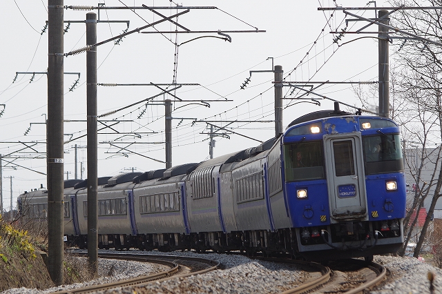 一夜明け、予報ハズレの快晴!早めの朝食をいただき、家族をホテルに残し朝練に出撃。超有名撮影地はあまり好きではないが、宇宙軒カーブは行ってみたく、高速で有珠へと向かった。3月改正前は相当なお祭り状態だったようだが、今日は3名でまったり撮影した。撮影後、登別温泉へとんぼ返り。登別ICで降りると、まだカシオペアの通過前だったので、近くの踏切でもう一発。ホテルで家族を迎え、さっきまで撮影していた機材一式とお土産を、「佐川急便の宅配便」で発送手配し、身軽になって、観光しながら札幌へ戻る(この後、とんでもないトラブル(こちらをクリック)が起きるとは予想だにしなかった・・・)。札幌駅には15時過ぎに到着、レンタカーを返却し、駅でお土産や食料・酒を買っているとあっという間に入線時刻10分前になった。 |