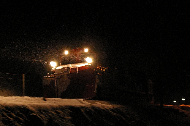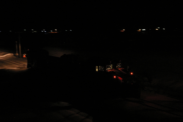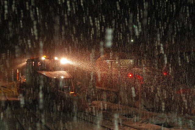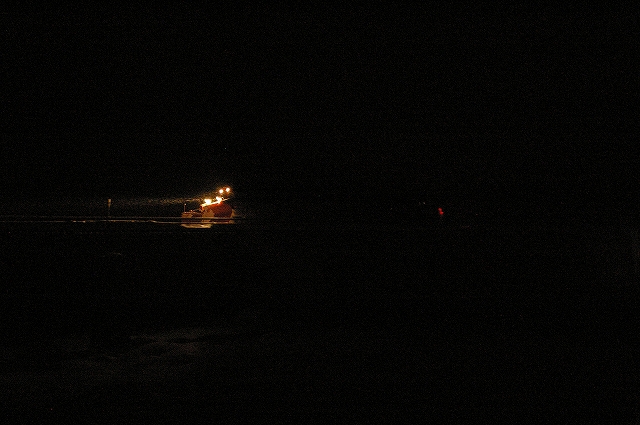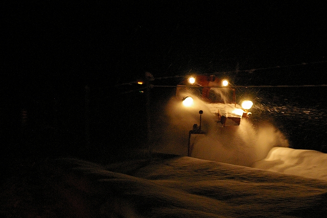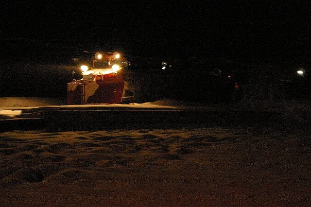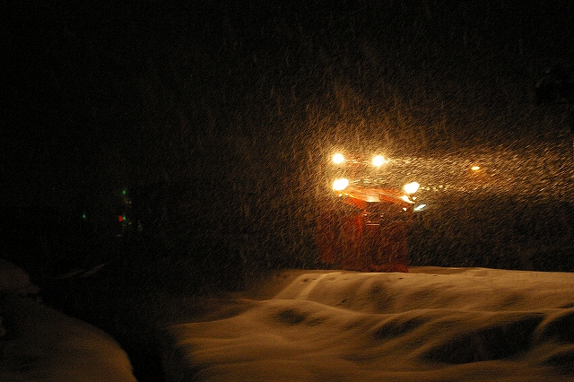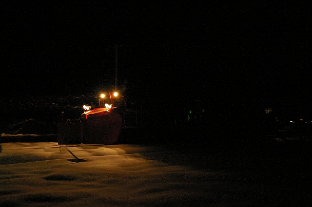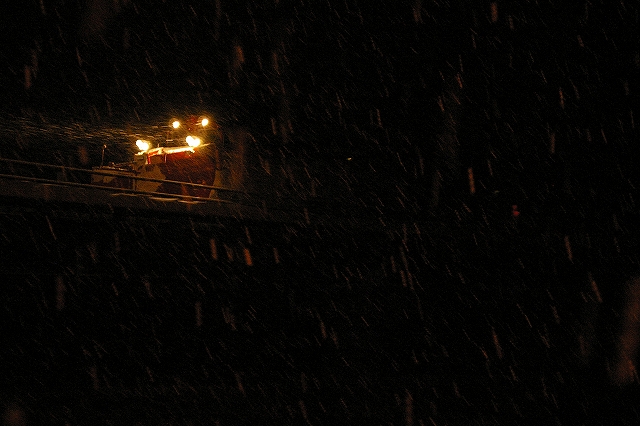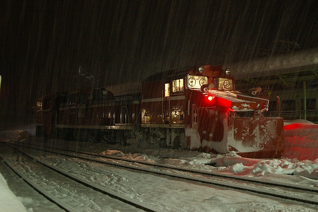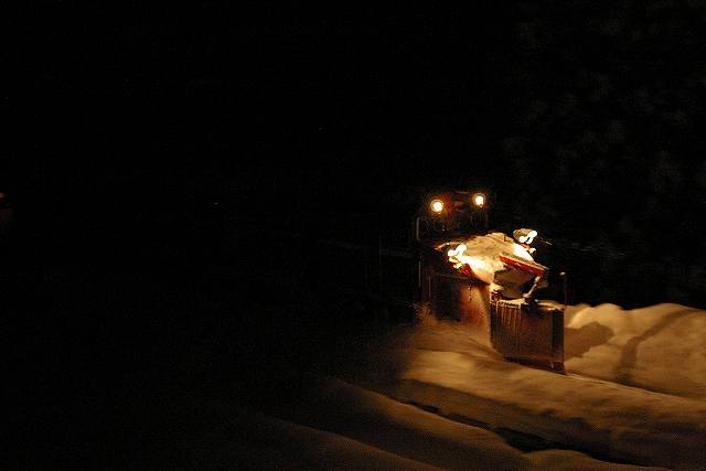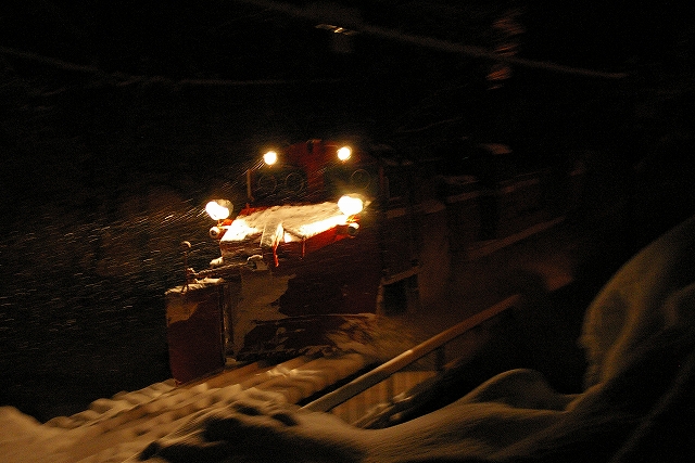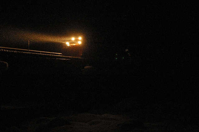 | 日中のボンたか1往復撮影という大収穫の後、夕方から氷見の日帰り温泉に入る。4時間仮眠で、昨晩の長岡バルブからの疲れをとる。予報でいけば21時に温泉を出る頃には雪のはずだったがフツーに曇り空。これは今回はスカか?とガッカリしながら高山の知り合いに電話をするとやはり曇りとの事。同行の友人Hが「ブリ鰤ぶり」と五月蝿いので、とりあえず閉店間際のスーパーで氷見の寒鰤刺身(半額!)とご飯を入手し、車の中で食べて今夜の予定を話し合っていると高山から電話で「DE15が出庫した、運転ありそう」との報あり。慌てて車を高山に向けて出発。どうやら早スジで出るらしい、高山発車は間に合いそうもないので古川辺りを目指し安全運転する。少しだけだが高速に乗り時間短縮し、富山ICからR41を行く。猪谷の手前から強い雪になる。かなり走り辛い路面状態になり、0時過ぎやっとのことで古川着。峠を越えたこの辺りは曇りで、積雪も少ない。ラッセルが高山を出たと情報が入っていたので、時間的にギリギリの飛騨国府〜飛騨古川で待ち構えた。先の踏切が鳴り出ししばらくして通過。以下猪谷まで追っかけのため詳細レポートなし。 |