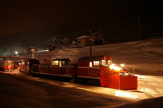 日本海側に大雪警報が発令されている31日夕方家を出た。途中駅で友人を拾い関越を北へ。情報収集しながら目的地を絞る。上信越道の妙高高原で降りて駅へ。大雪でホームは埋もれ、駅前に終日運休の看板が出ていた。夜のDE15ラッセルの運転も無いようなので、再び高速に乗り富山へ。高山本線でラッセルの運転を期待して待つ。
