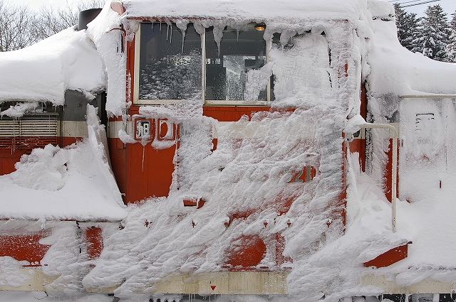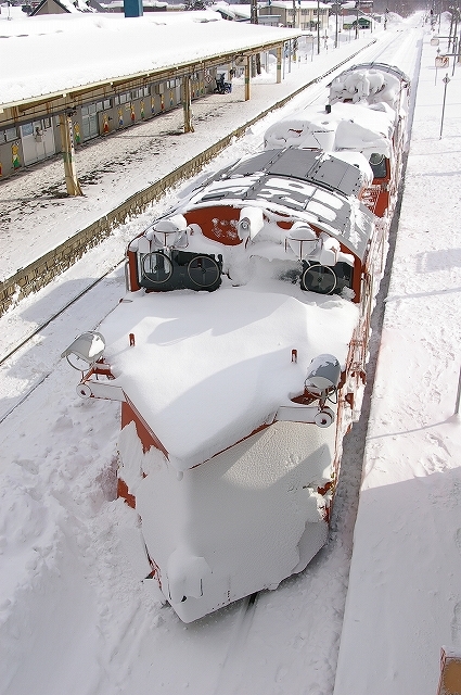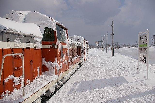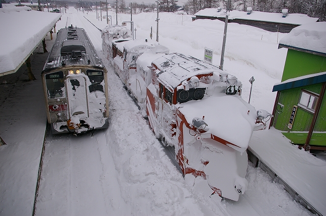 2521は停車したままだった。機関車の調子が良くないようで、処置後遅れて発車して行った。追っかけるが、地吹雪で車の運転もままならないので、幌延の先で一回撮影し宿に戻る。帰る途中でに更に地吹雪が悪化、天塩大橋で吹き溜まりでの事故で足止め。橋の上で強風にグラグラ揺られ続け2時間、幌延の宿に戻ったのは18時過ぎだった。 |