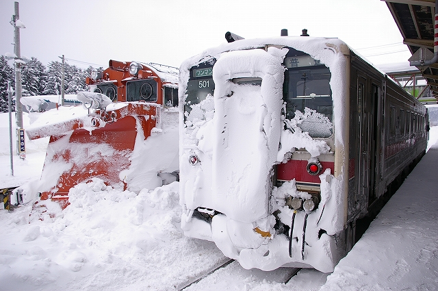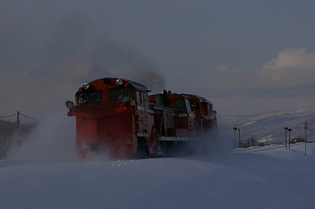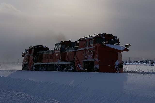 | 最終日16日も前日の吹雪の影響を受け、宗谷本線名寄以北は午前中運休。様子を見ながら名寄まで出る。途中、美深辺りでマイナス20℃を車の温度計で計測。外に出ると寒さで耳が痛い!比布から少し入った協和温泉で早めの昼メシ&昼寝。名物の行者ニンニク入りスタミナチャーハンを食べる。香りと味がイイ、元気が出るチャーハンだ。午後の宗谷ラッセル旭川口下りを一回撮影し石北ラッセルへ向う。 |