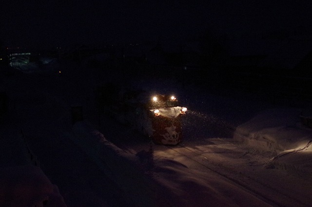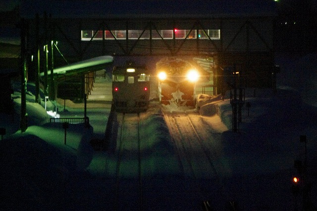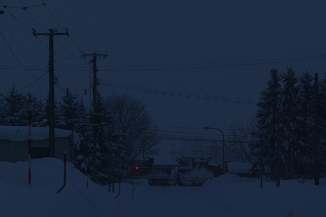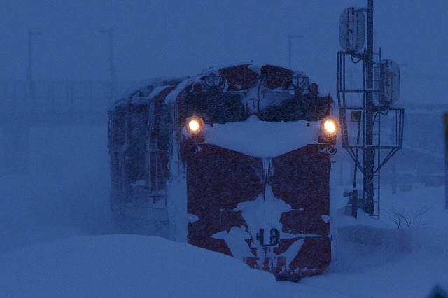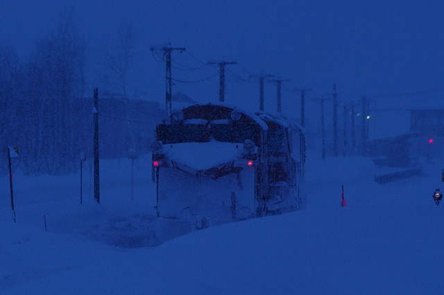 和寒〜東六線で撮ろうと、撮影地に近付くと踏切が鳴った。まだ来ないよなと見ていると、そろりとラッセルが通過、南部のダイヤ乱れで旭川接続の普通列車が遅れたため時変をかけ、早く発車しているようだ。慌てて追っかけるも、士別駅手前でかろうじてウィング閉じ状態がキャッチできただけだった。士別駅先の陸橋で発車を待つが動きなし、結局328Dの到着を待ってここからは定時発車だった。真っ暗で露出のない中せっかく待ったのだからと無理やり撮影し、2014北海道ラッセル終了。時間がおしてしまい、旭川空港で飛行機に乗るまでハラハラドキドキだった。 |