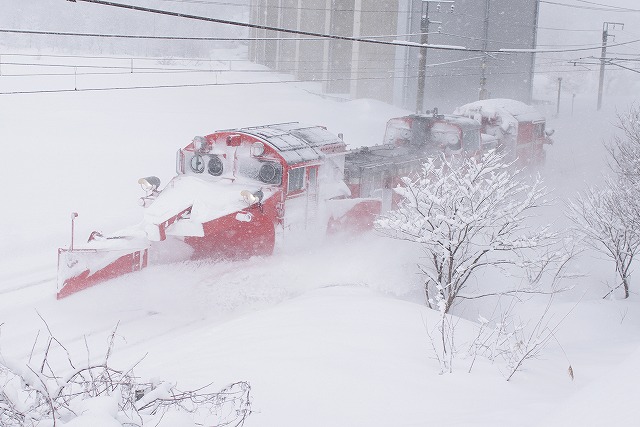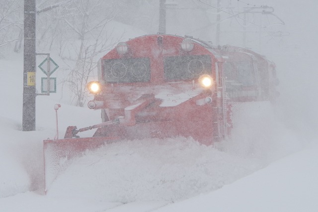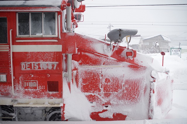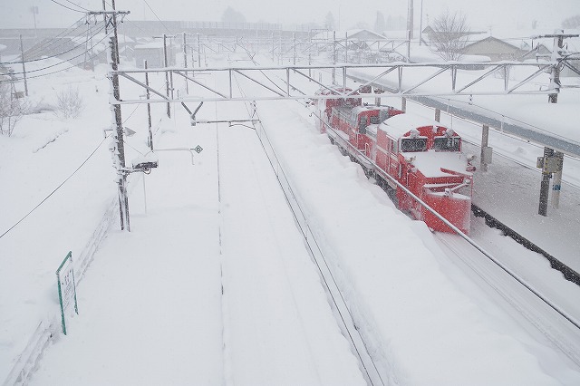 新井を過ぎると雪が強く降りだし、姫川原のカーブもかなりの降りだった。その先は吹雪で待っているのも辛く、長玉では真っ白になってしまうくらいだった。黒姫〜妙高高原の高速下では、しなの鉄道115系3連の、下り試運転の直後にラッセルがきた。さらに黒姫駅まで追っかけて、停車を撮った。美味しそうな駅そばの汁の匂いに、うしろ髪をひかれつつ折返しポイントへ。