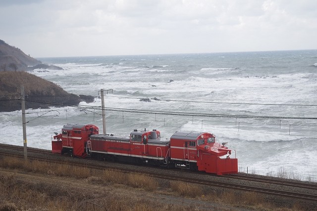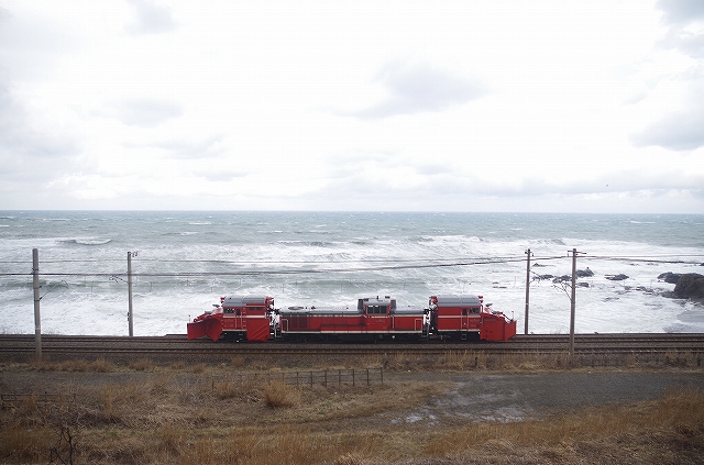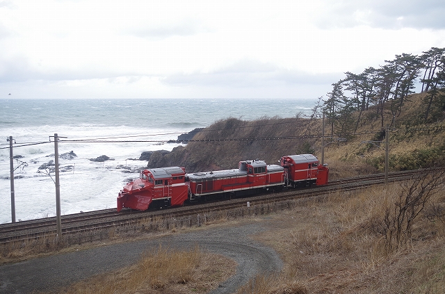 | 冬季体制解除に伴い、25日のDD14につづき、DE15も長岡へ。前日からの強風のため、柿崎〜柏崎は午前中運休になり、この回送の運転も危ぶまれたが、同区間運転開始後の2本目として大きな遅れなしで通過。1本目の下り鈍行が最徐行で通過したので、同じくらいの遅れで徐行していくだろうと油断していたので慌ててしまった。鯨波のポイントは撮影者10名だった。 |