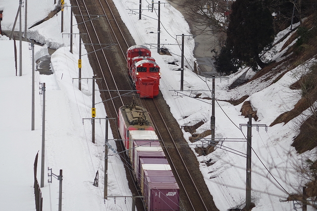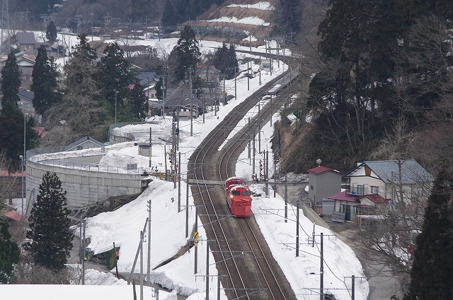 柏崎の停車を使い長鳥へ先回り、予定していた俯瞰ポイントは手前で冬季通行止めになっていた。ゲートの所から徒歩で峠へ。雪道をザクザクと歩いていると、雪の上をウサギが飛び跳ねて行った。俯瞰ポイントから、きっと最後になるであろうDE15
