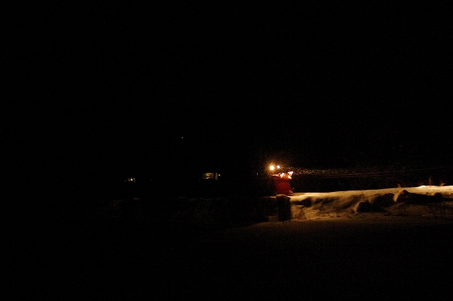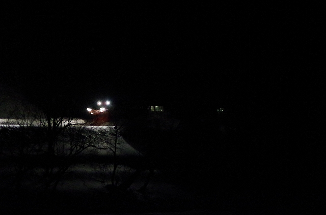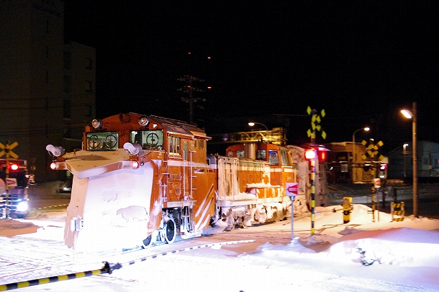 | 雪捨てダンプのライトに照らされ踏切を渡る |