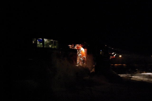 北海道ラッセル遠征初日。石北本線上川までのロケハン後、宗谷本線南比布駅付近からスタート。宗谷南線の雪は少ないので、検討中だった稚内行きを決定。士別の先まで追っかけ、道の駅で仮眠して21時過ぎに起きた。名寄から様子を見はじめて、智恵文の先からスタートした。 |