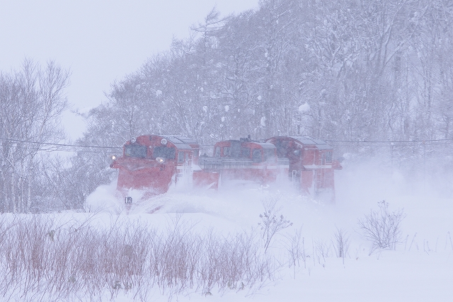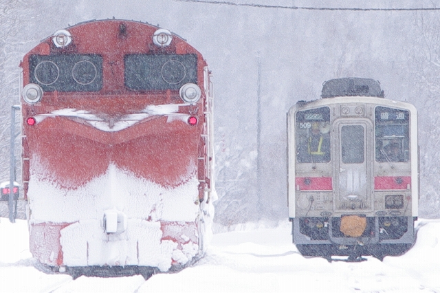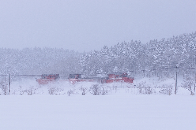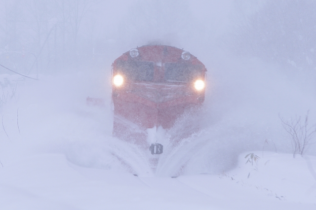 幌延までは追っかけが厳しそうだ。抜海を出てすぐに雪が降りだして、時折吹雪き撮影と追っかけに厳しい状態が続く。南幌延駅で撮影していると一旦駅に停まって発車していった。毎度の追い付きポイント雄信内〜安牛のカーブでは、前回同様片側のみウィングを出して通過、ここの踏切の決まりなのだろうか。 |