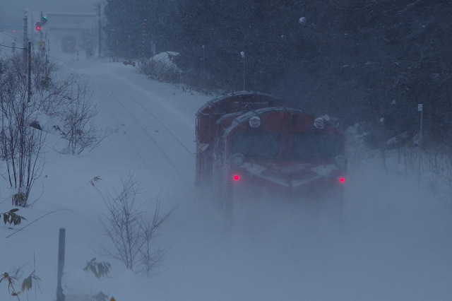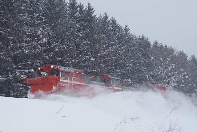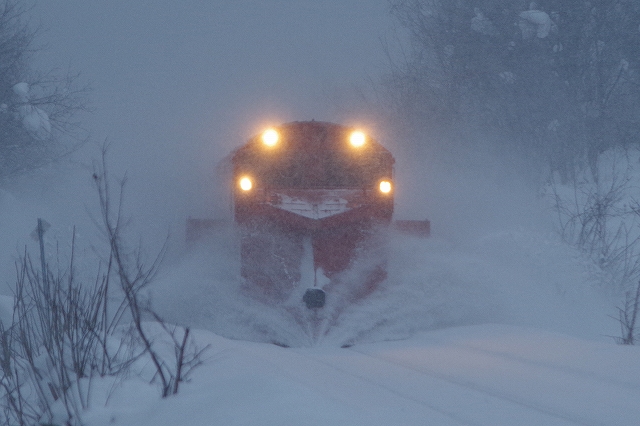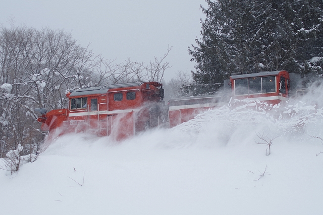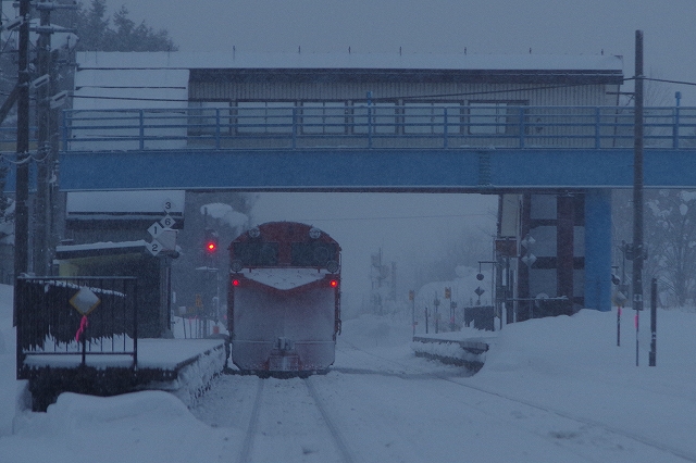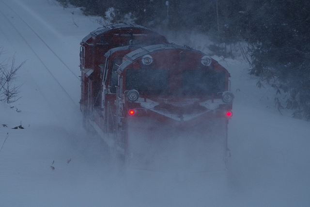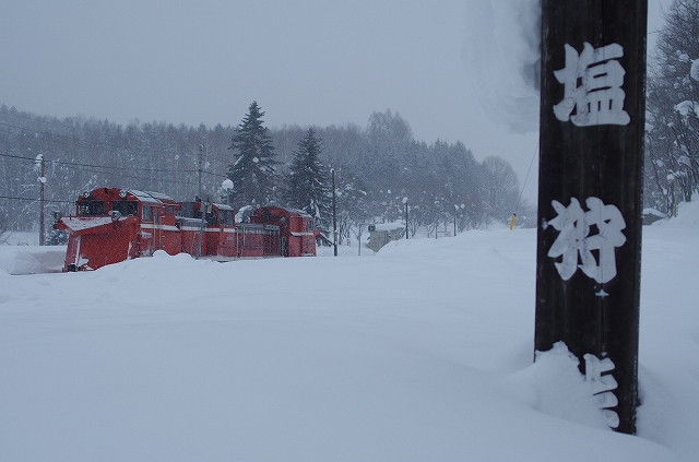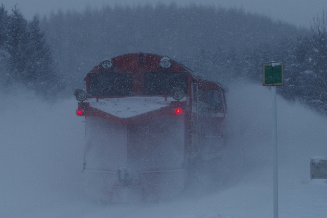 | 音威子府に近づくにつれ雪は強くなり、この先の撮影を断念し南線へ転戦する。音威子府の駅そばはパスして塩狩峠へと向かった。塩狩峠付近は昨日より積雪があり期待できそうなので、かんじきを履き雪原を線路目指して歩く。あまり時間がないので一気に線路脇に出たら、足ガクガク心臓バクバクになった。急いでセッティングすると、ほどなくラッセルが通過、昨日よりも多く雪を飛ばして行った。塩狩の停車で追い越し、塩狩〜和寒で待つと吹雪いてきた。 |