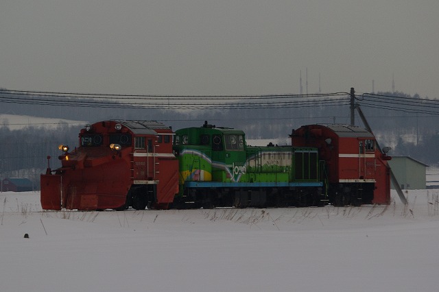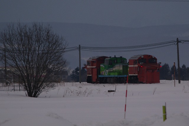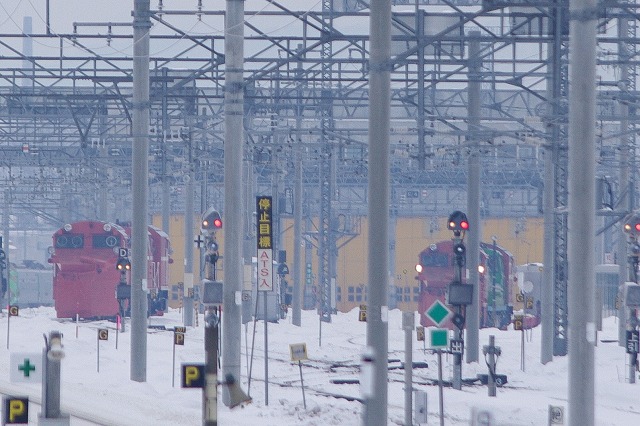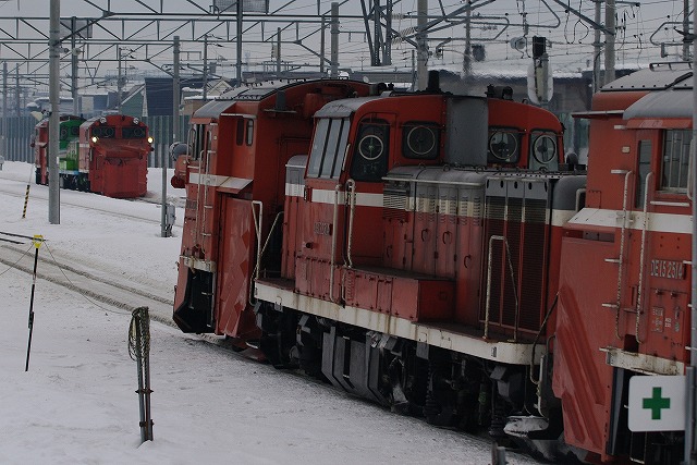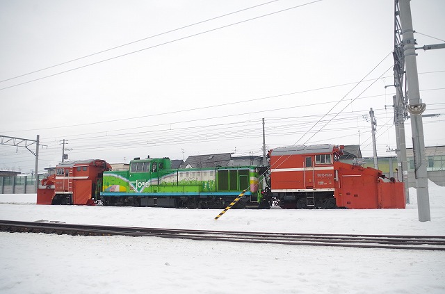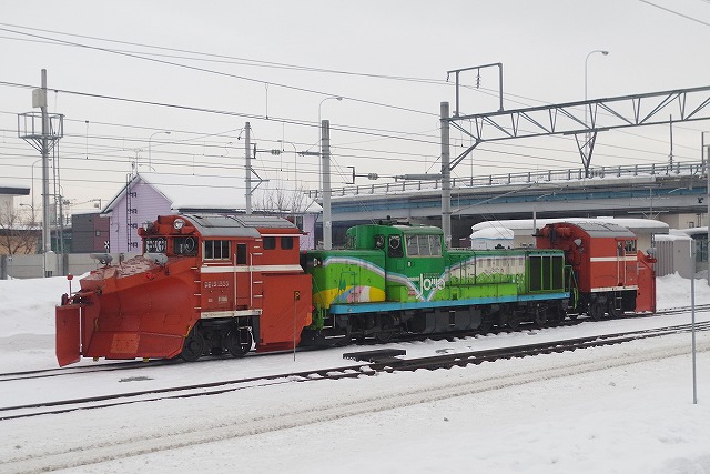 宗谷ラッセルが大ヒットの2017シーズン、各有名撮影地は連日多数の人出とのこと。今年は家族旅行ってこともあり、混雑している宗谷を避けて石北を中心に攻める。渡道初日は期間限定のDF200のカシオペア紀行を撮影した後、宗谷・石北ともラッセル運休の情報を得たので、層雲峡温泉に早めにインしのんびり過ごす。2日目も早朝の石北上りラッセルは無いので、寝坊し温泉に浸かりのんびり。午後から出撃した。旭川運転所で、未撮影だったノロッコカラーのDE15