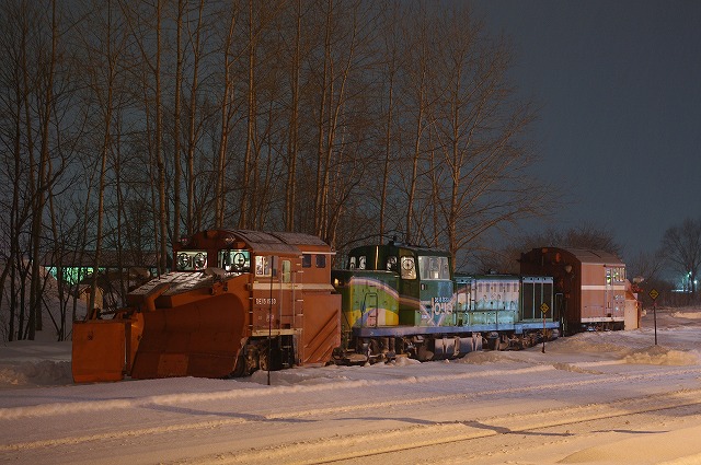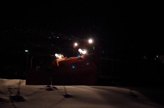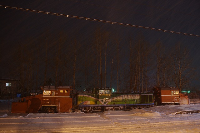 雪が強く降りだしてきた上川駅でラッセルを見送り、層雲峡温泉に戻った。温泉に浸かり、美味しい北の味覚を堪能した。明日は早起きだがこんなラッセル撮影もなかなかイイもんだ。 |