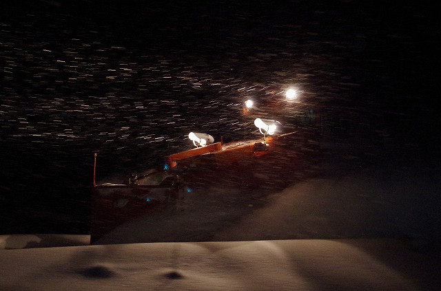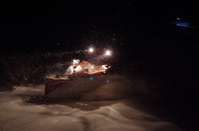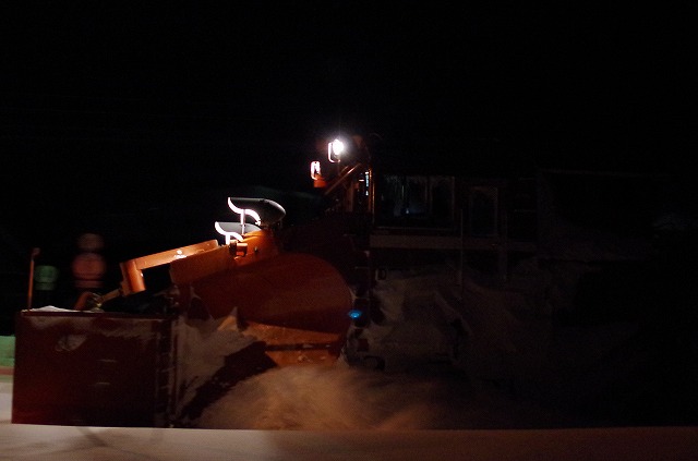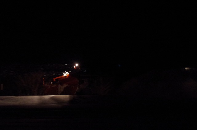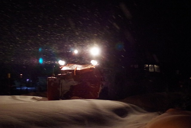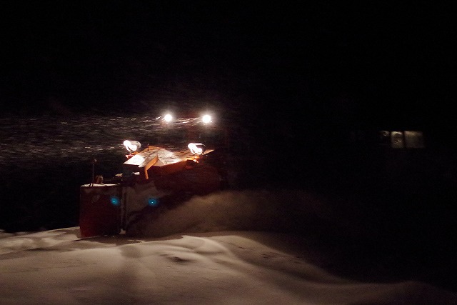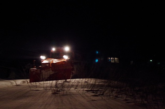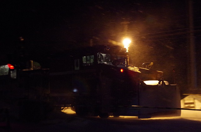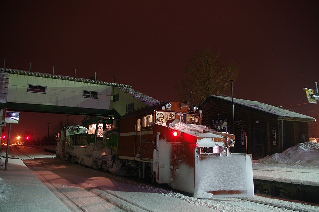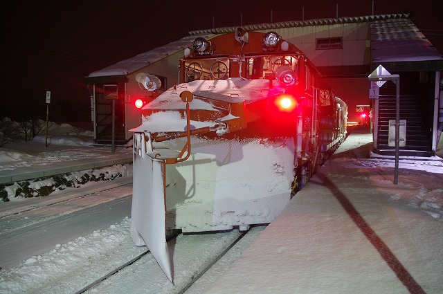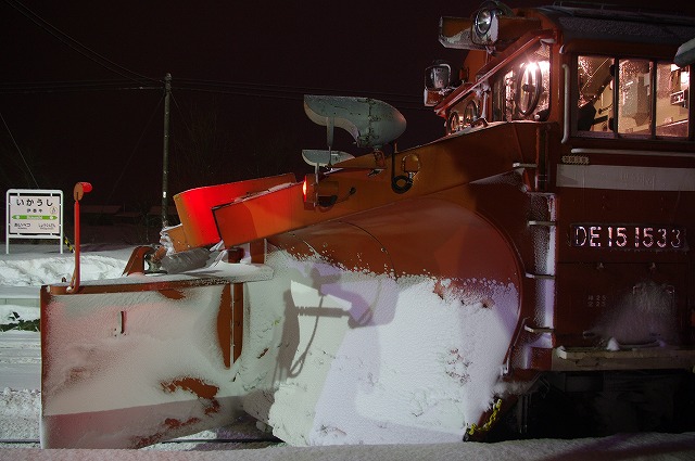 今年は石北を中心に攻めている北海道ラッセル。最終日は層雲峡温泉を3時に出発し、吹雪の中を上川へ。峠を過ぎると雪は弱まった。上川手前で、遠軽からのノロッコカラーのDE15 1533ラッセルを迎え撃つ。