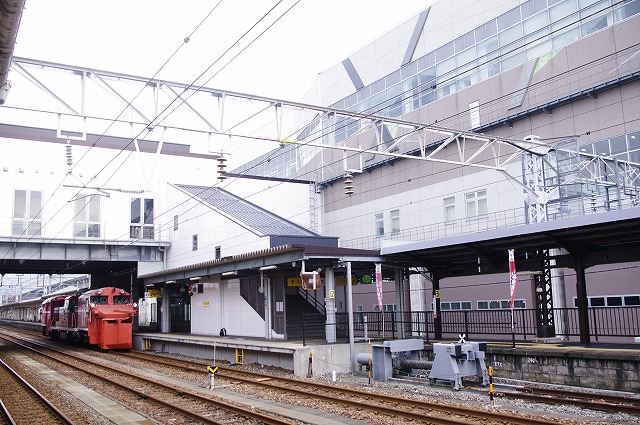念願の姫川鉄橋で撮影をして糸魚川駅へ。他に撮影者は数名、広々とした構内にポツンとラッセルのみ。単行のキハが直江津に向かって発車して行くと構内はさらにガランとした。 |