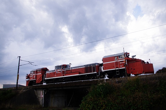 夜遅く出発し、早朝の篠ノ井霜取りクモヤを撮影してから、糸魚川経由で魚津へ向かった。富山地方鉄道の西魚津駅付近をスタート地点にして待ち構える。ここで撮影するのは33年振りだ。富山地方鉄道を撮りながら待っていると、遠くで一旦停止しているDE15のライトが見えた。しばらくして運転再開して目の前を通過して行った、カマ番はDE15