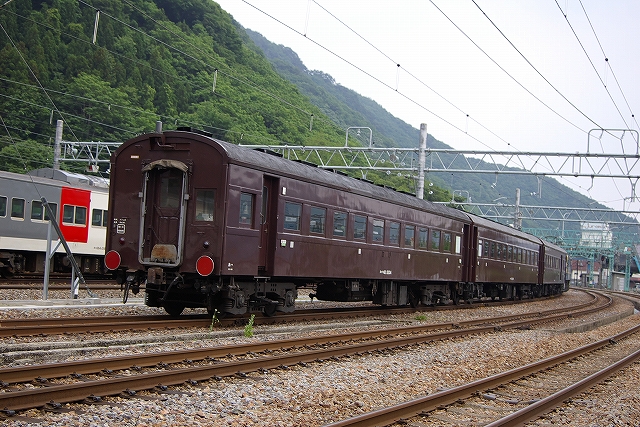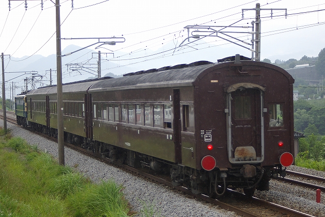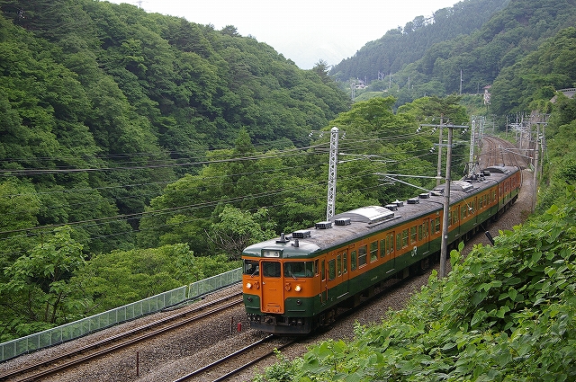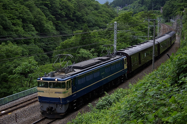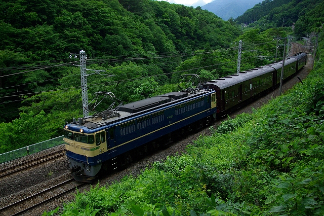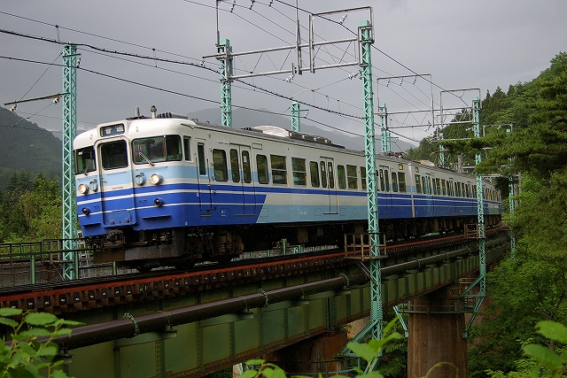 | 毎年恒例、会社仲間のキャンプの行き先を「移動距離が遠い事」を理由に、今年は福島から群馬に変更した。水上付近にした理由は法師温泉や宝川温泉・湯の小屋温泉など温泉マニアが喜ぶ秘湯が多く、湖もいくつかあるからだ(ナナゴーが来なくなったのと、ロクゴー+旧客があるのも実は大きな要因なのだが、非鉄の仲間達は知らない)。高崎線ブルトレの朝練をしてから水上道の駅で仲間と合流し、奥利根の山中にベースキャンプを作り昼メシ。その後は釣りだ!カヌーだ!と自由行動、私は線路っ端へ。下りは上牧〜水上の諏訪峡橋上より。この橋、眺めはいいが深〜い谷に架かっているのでえらく高い。谷底に吸い込まれそうで待っている間怖かった。 |