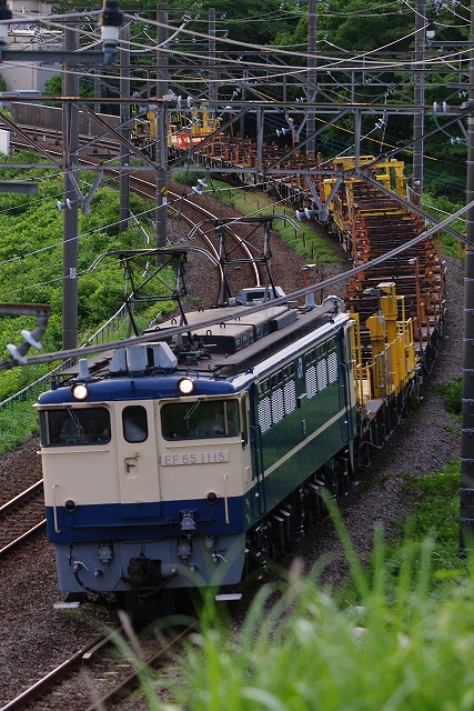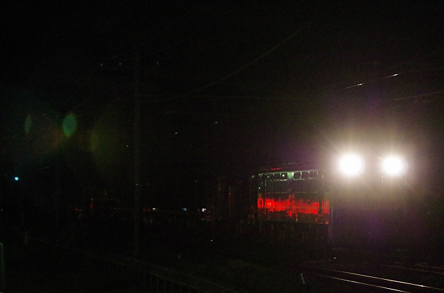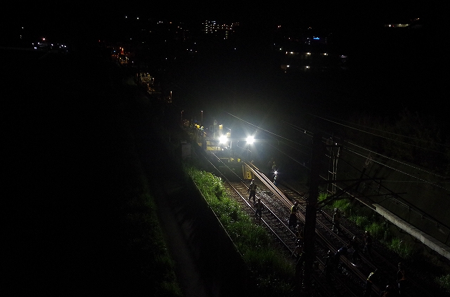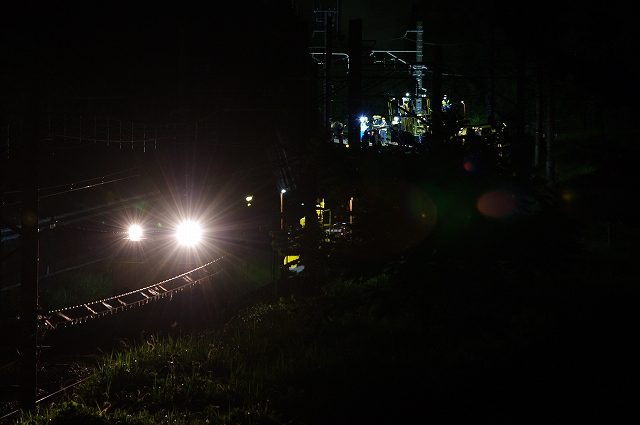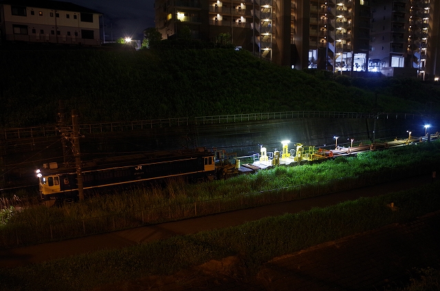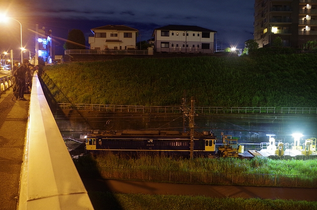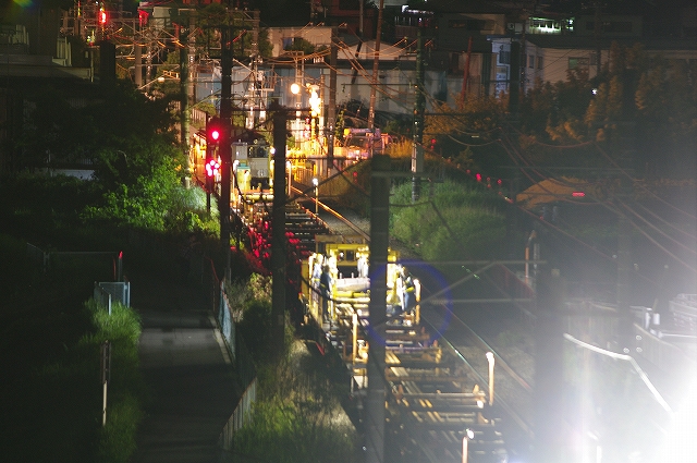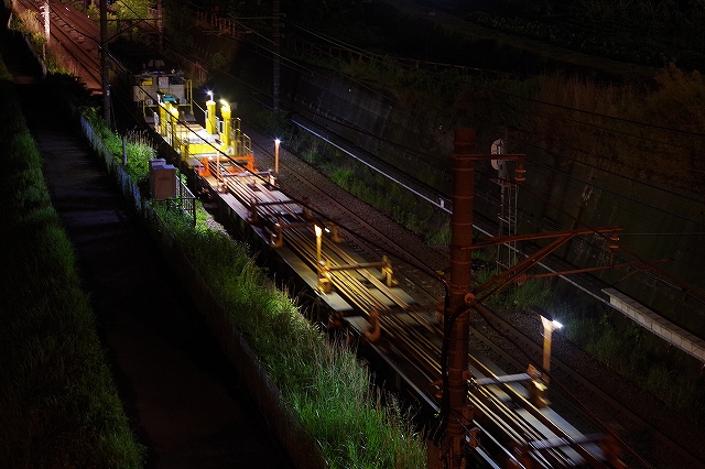近所を走るJR横浜線の工臨を初撮影。翌日に仕事があるので、八王子まで行かずに、仮眠してから中山付近の走行からスタート。案の定真っ暗だ。その後、追いかけて今日の作業開始地点を確認。小机〜鴨居の鶴見川の道路橋の鴨居方からだ。夜工臨初心者には最適なスタート地点だ。鶴見川道路橋に着くと既に10名以上の方がスタンバっていた。カーブの向こうから、止まっては最徐行の繰り返しでPFがやって来る。慣れていないので、走る止まるの間隔が分からずバルブのタイミングが合わない。