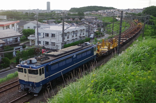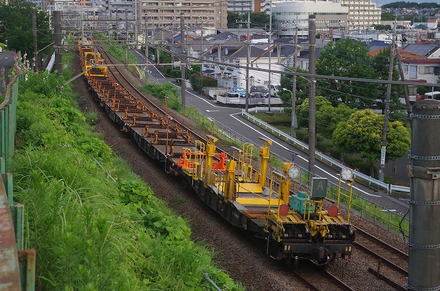 橋の下辺りでやっと間隔が分かってきた。先頭が橋をくぐり、道路の反対側から後ろ打ちする。最後部が抜けたので出発。ロングレールなので小机駅を越えるかと思ったら、トンネル辺りで終了との事で、先回りしていた小机駅近くの踏切はいいスピードで通過して行った。 |