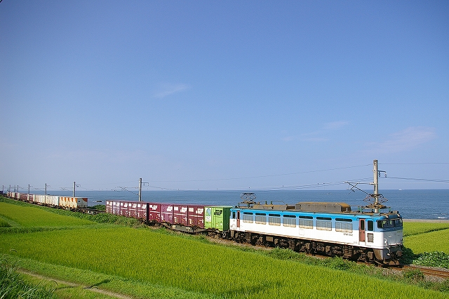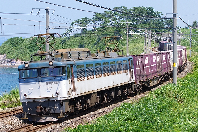 まずまずの成果を得たので、高速で日本海沿いを南下。午後の部は鯨波の海バックで。とにかく日差しが強く外に出る気力が出ない。車の中でセブンイレブンの冷やし中華を食べながら待つ。さっき、村上〜間島で撮った4060レEF81