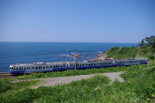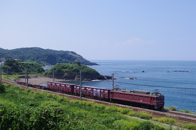 家を16日の21:30発。関越をひた走り、途中仮眠1時間、走行430キロ3:30に勝木駅に到着した。この辺りだけ霧雨だった。丁度、EF81が2本下っていくのでそれを撮って少し仮眠。夜が明けたところで、勝木〜府屋のポイントに移動、4年ぶりに来たがあまり変わっていない、手前にセブンイレブンが出来て便利になった。特急日本海からスタートする。その後、越後寒川駅に寄って村上〜間島へ移る。まだ午前中だが日差しが強烈だ。 |