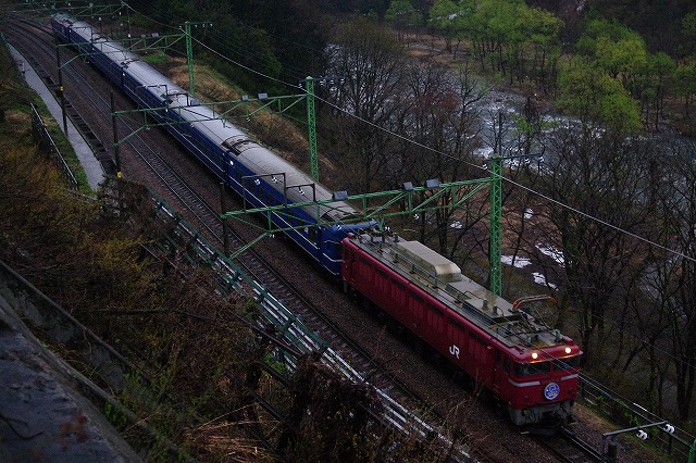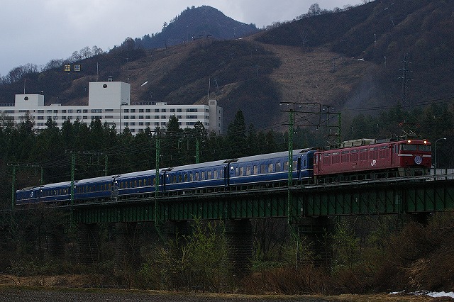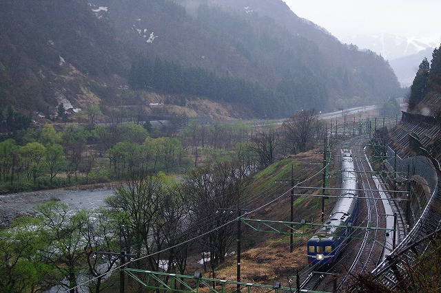 スタートの湯沢付近は、晴れれば露出もあったろうが、生憎の雪混じりの雨でドン曇り。魚野川沿いのポイントの道脇にはフキノトウがたくさん出ていた。摘んで帰り、家で天ぷらにしてビールのつまみにして食べたら相性サイコーだった。土樽でも天気回復無く、霧も流れかけてきたので、メインに考えていた土樽俯瞰は諦めて鉄橋で撮影し、高速でもう一丁追っかける。 |