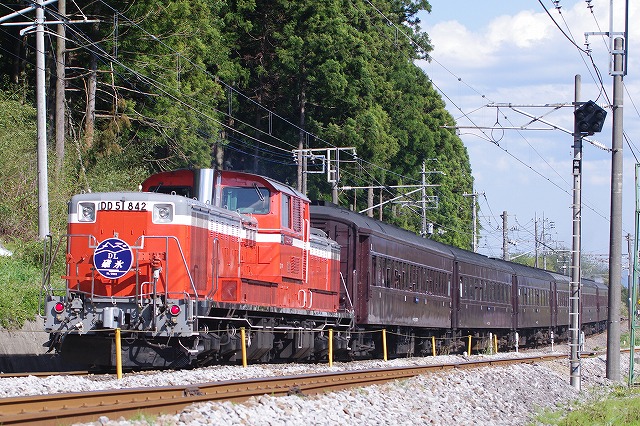 信濃追分で急行ありがとう・さようなら169系を見送り、最後の下りはパスして帰路に。ナビで確認すると、SLの横川発車に間に合いそうなので少し急ぐ。横川をSL発車の5分前通過だったので国道沿いの後ろ打ち出来そうな所で待つ(当方DD51狙いなもんで・・・)。SLた当然ながらドスカ煙だったが、後ろのDD51に煙もかからずバッチリ。HMもブルトレ風で格好良く大満足だった(家20:30着 走行622km)。 |