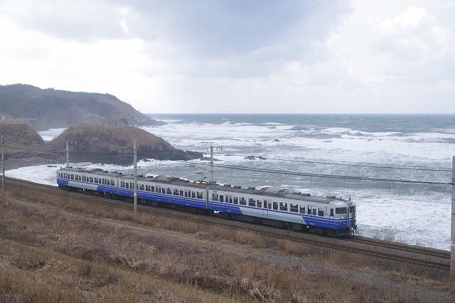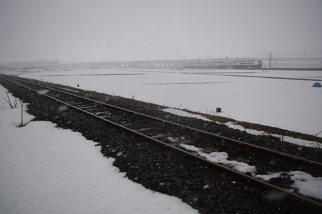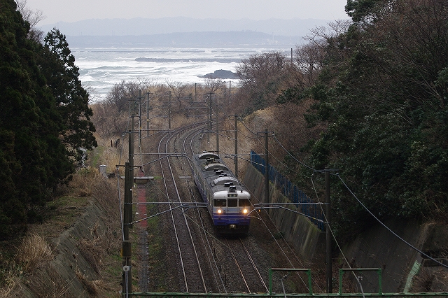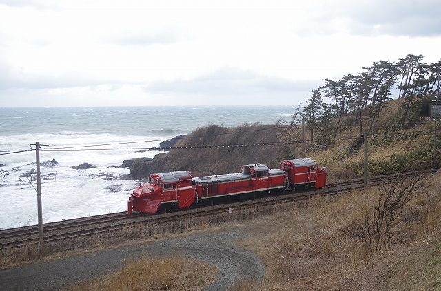 脇野田あたりはそれほどでもなかったが、前日からの強風のため、柿崎〜柏崎間は午前中運休になっていた。DE15ラッセル回送の運転も危ぶまれたが、昼前から鯨波で張って待つ。強風で車がグイグイ押される。同区間運転開始後の2本目として大きな遅れなしで通過。1本目の下り鈍行が最徐行で通過したので、同じくらいの遅れで徐行していくだろうと油断していたので慌ててしまった。長鳥〜塚山と鯨波のポイントを行き来し、27日は撮影終了した。 |