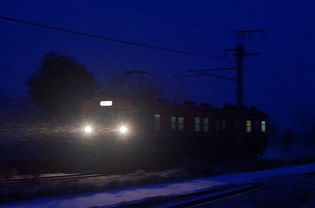 | 撮り初めは、正月休みを使って信州と上州の単コロ巡りをした。スタートは、篠ノ井線の霜取電車。現地に着くと小雪が舞っていた。往路は坂北駅で見送るが、駅照明も落ちて真っ暗、アークも少なめだった。復路も雪が止まない中、西条を挟んで2発。その後信越本線のELレトロ碓氷号のEF65 501を撮影し、上毛電鉄に向かい、デハ101と30年振りに再会した。 |