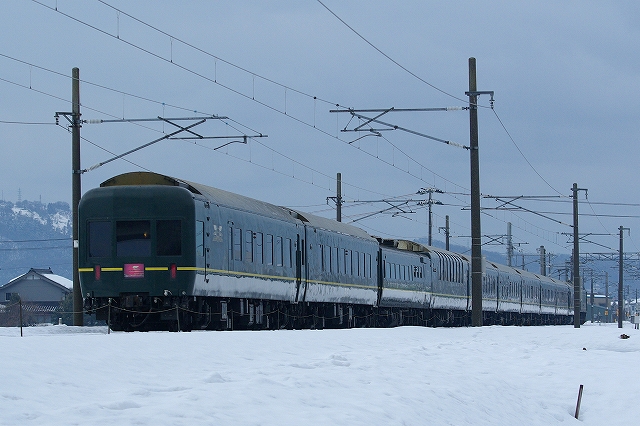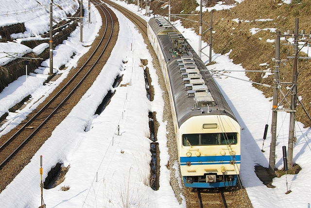 氷見貨物撮影後城端貨物へ向かう途中、同行者がボンたか情報を入手、はくたか9号が489系代走との事。急遽目的地を呉羽に変更し、待ち構える。同業者3名と一緒に見送る。 |