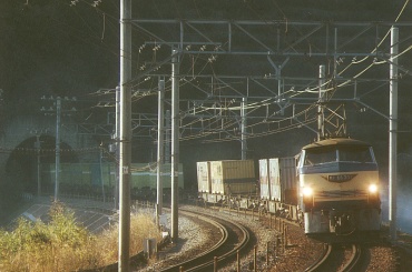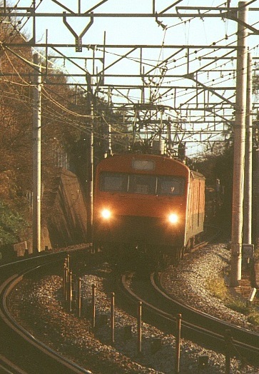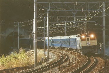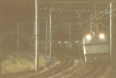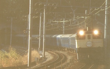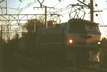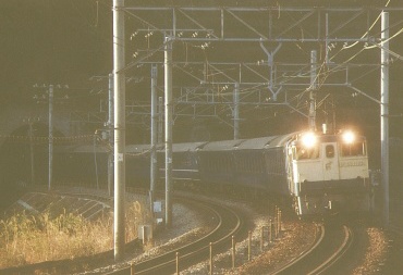 原チャリで家を6:25に出て、途中でホット缶コーヒーを買って7:25に早川〜根府川間の米神踏切に着いた。他に鉄道ファンはいなかった。かじかむ手を缶コーヒーで溶かしながらカメラをセッティングする。7:49踏切が鳴り、トンネルの向うでやけに高い汽笛が聞こえた、なんかゴハチっぽい音だなと思いつつファインダーを覗いていると茶色いゴハチがやって来た!EF58