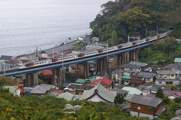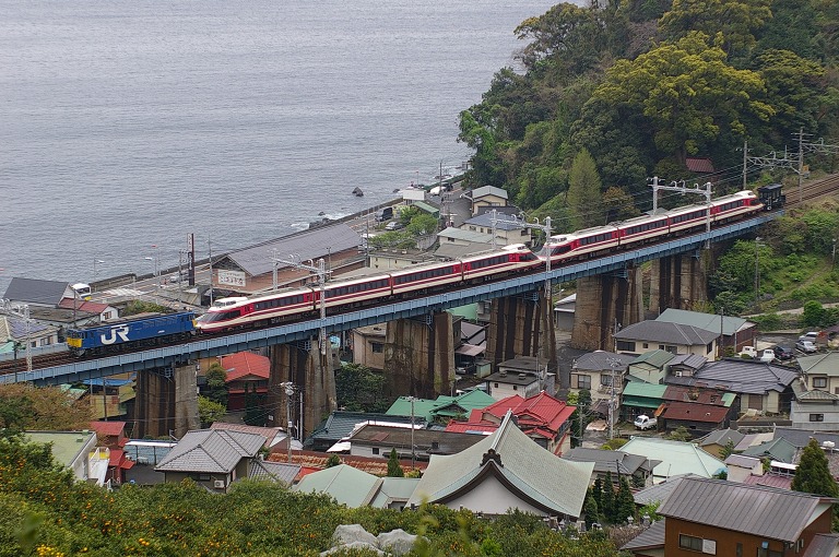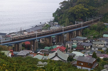 11:08十日町市内のへぎそば屋(285キロ)着、名物の山菜天へぎそばを頼む。「へぎそば」とは、板の上にきれいに盛ったそばのことだと知った。コンセントを借りてPCを充電する。そばは当然のこと、ふき・うど・竹の子・こごみ・アスパラの天ぷらも美味しかった。そばを半人前おかわりした。お土産にそばとツユを買った。12:00へぎそば屋発、眠気も吹っ飛び快調に山越えする。R8に出て程なく、12:45鯨波撮影ポイント(328キロ)着。さっきの昼メシタイムを悔やんだ。鉄道ファンが150名以上いる、このHiSE甲種最大の人出だろう。日本海とロマンスカーの最初で最後の組合せ(たぶん)を狙うのはファンとして当然の心理であった。手持ちで撮る事にして隙間に混ぜてもらった。 | ||||||
