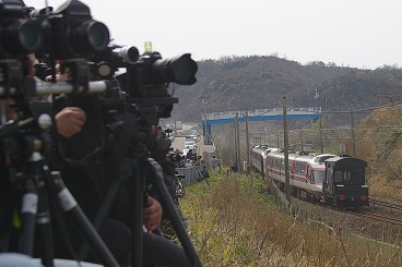 通過時刻には200人以上に膨れあがった。直ぐに撤収し追っかけ開始、14:10発。ここから新井にかけてが一番移動時間に余裕がない。先頭グループで快調に飛ばす。県道のショートカットで通過25分前の15:18新井〜二本木間(378キロ)着、高圧線が一本うるさいが、いいカーブだ。R18を続々と追っかけ車が行く。ここは鉄道ファン3名だ、189系・115系と短時間で効率よく写せた。 | ||||||