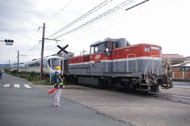 11:43 DE10 1581+RSE20002×7 監視員の赤旗に守られ良通踏切をそろりそろりと行く |