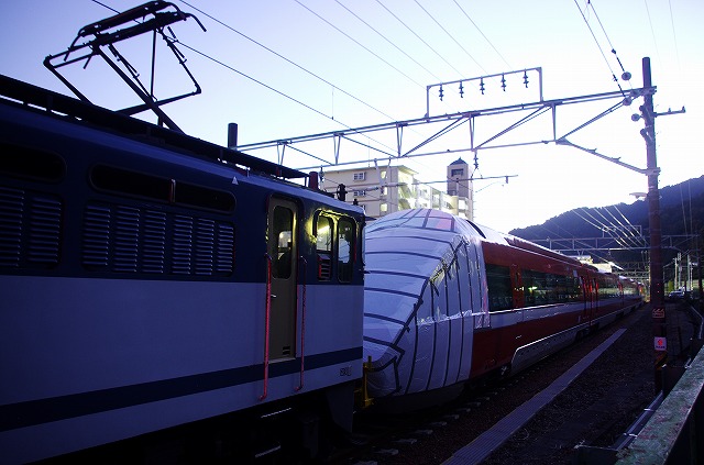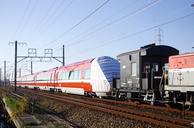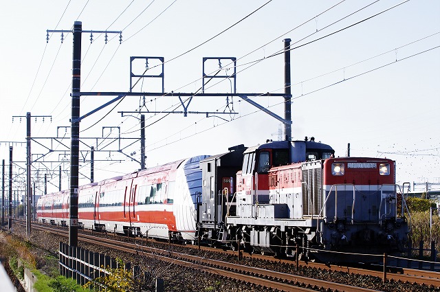 小田急の新型ロマンスカーGSEが、豊川の日車から甲種回送された。子連れのため有名どころを避けて西浜松前後で撮影した。愛知県民の森のバンガローに前泊して、午前中は本長篠辺りで紅葉と飯田線のプチ撮影後に舞阪へ。ここはMSE甲種の時撮影し、空いているのは確認済みだ。ネットで情報収集すると、日車工場や浜名湖付近は相当の人出のようで、昨年のEXEαとの差は歴然だ。GSE甲種通過時にもう一人地元の方が来て、まったり撮影。