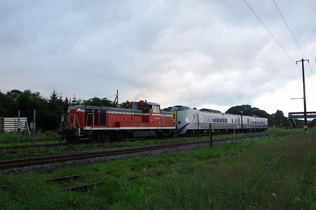 | 早朝5時、まだ列車が来ない時刻なのに駅の接近放送が聞こえて、飛び起きる。カメラを構えて待つとDE10が特急車両を牽いて登場!函館への配給列車のようだ。朝からツイている。今日が北海道最終日、出発まで函館本線のキハ40撮影だ。一昨日撮れなかった駒ヶ岳との絡みを期待。 |