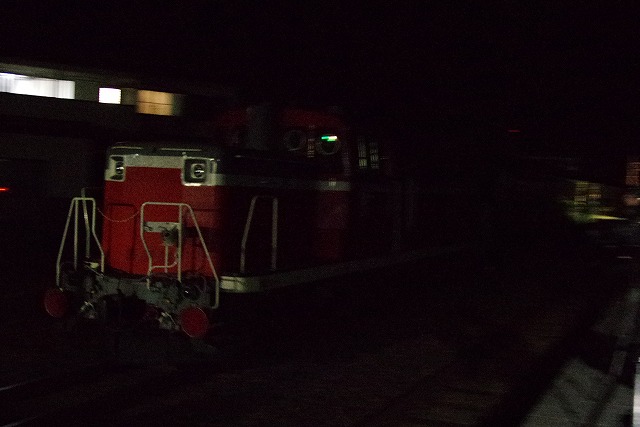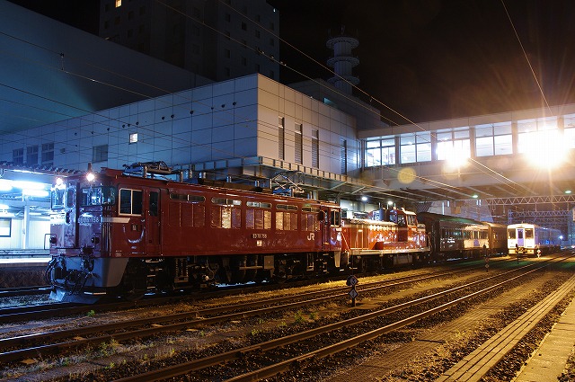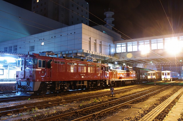 758のパンタが上がる。運転確定だ。停車時間のある楯山駅へ先回りして待つ。事前情報の23:20を過ぎても来る気配が無く、他の撮影者と話していると後部標識がどうのこうのなど、情報が錯綜している。身体が冷え切ったところで列車接近の自動放送が鳴り到着。一旦停車するも即発車、まともにバルブできず残念だった。30分延でスジが読めないので深夜の追っかけは諦め、郡山方面へ向かった。 |