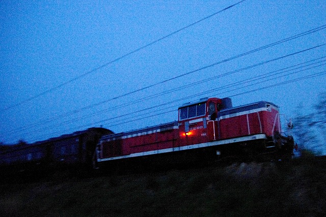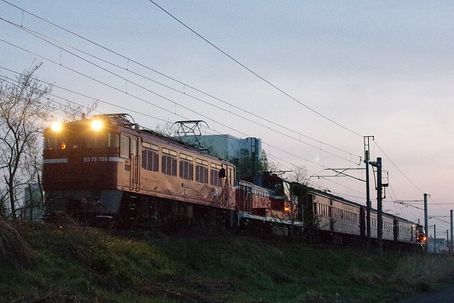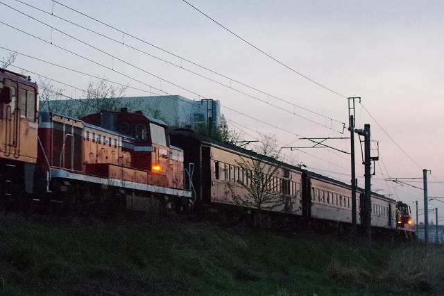 | 楯山駅から一気に南下し郡山付近に2時過ぎ着。車で2時間仮眠してスタンバイ。夜明けが早くなってきているので、4時半頃なら高感度で撮影できそうだとフンでいる。狙い通り、夜明けのほのかな明るさで旧客回送が撮れた。眠い目をこすりながら、鉄印集めに真岡鐡道へ向かった。 |