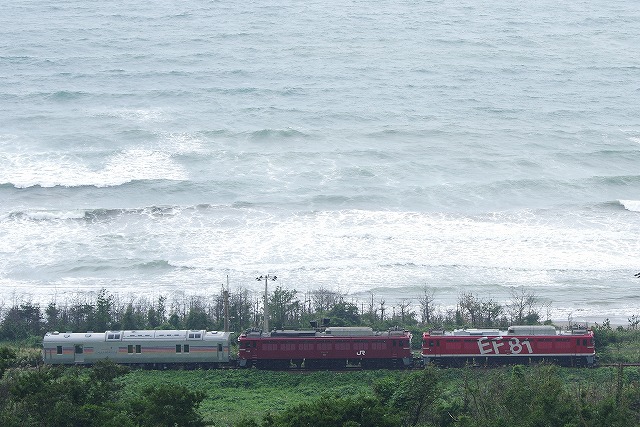 6月の秋田行カシオペア紀行のラストランから3ヶ月、既にE26系(保存車の一部を除く)は長野へ回送され、残るカヤ27と牽引に活躍していたEF81が秋田へ廃車回送されると情報を得て撮影へ。スタートは浜館公園俯瞰。直前まで暴風雨が凄かったが、雨が止み少し明るくなったタイミングで通過。高速を使って雄物川鉄橋へ。